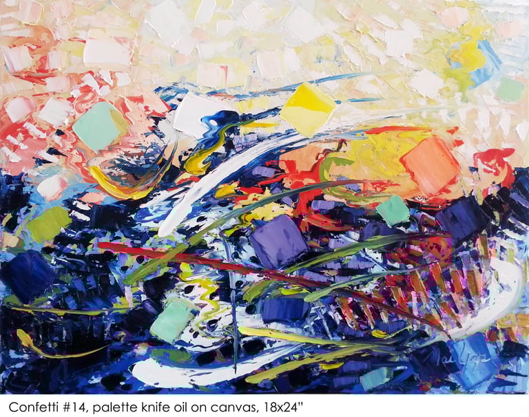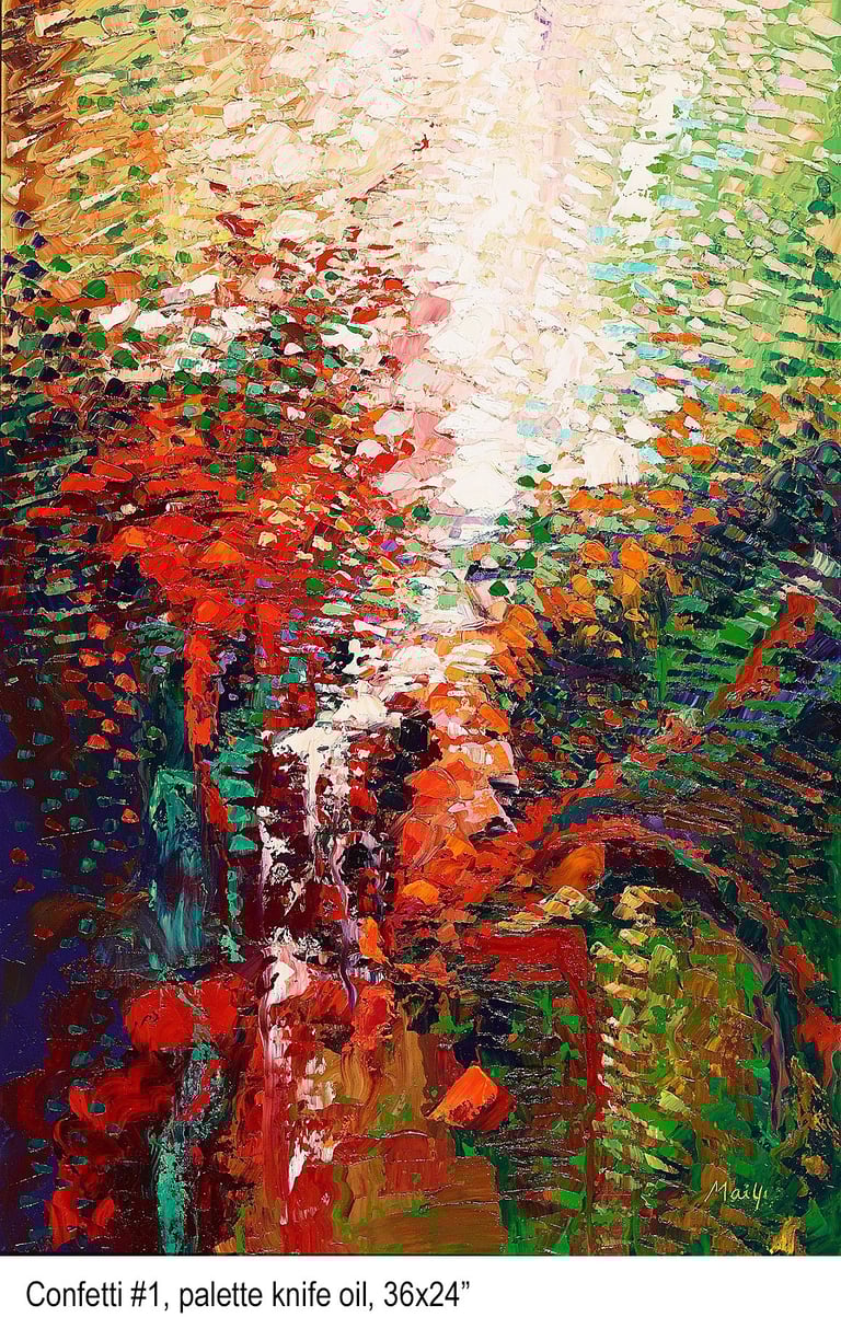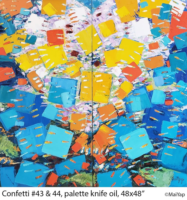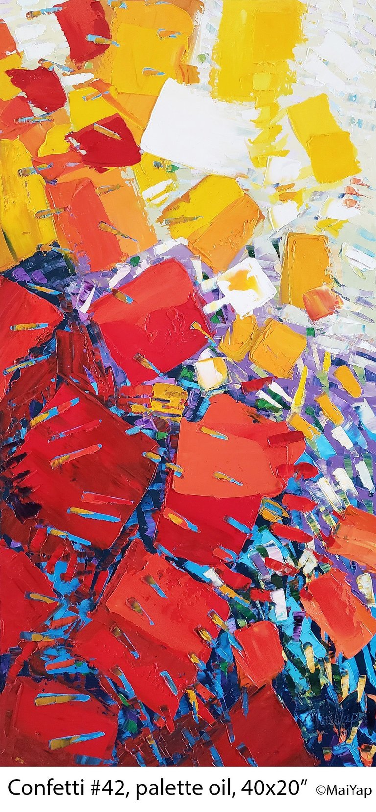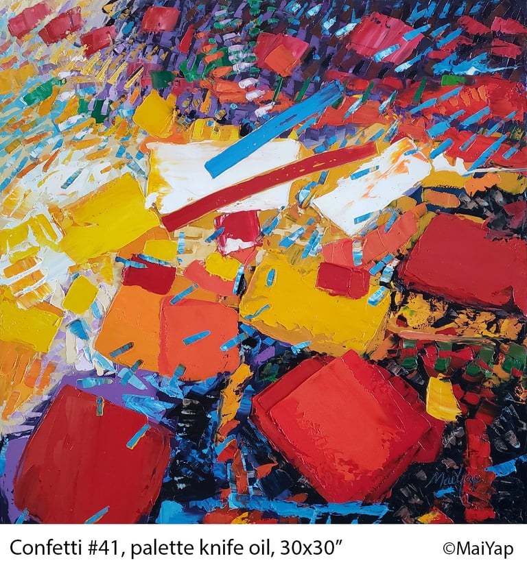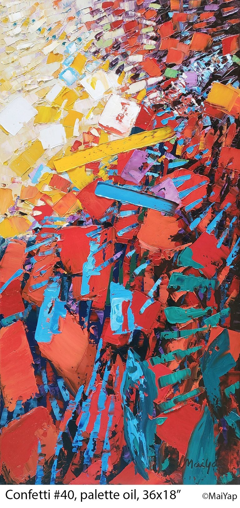 MaiYap’s abstract work is the compilation of a lifetime observing human nature and natural phenomena from flowers to lightning. It’s an attempt to depict the world as it is right now; a place of immense beauty yet violent and in conflict. Life’s energy mixes and explodes in a cornucopia of pure colors which are painstakingly applied stroke by stroke, layer by layer, like weaving a tapestry with paint. The result is a piece that grasps you with an unexpected undulating force. Subjects like hope, happiness, love, pain and frustration seem to constantly permeate throughout the experience. She calls this series Confetti because life is about learning how to dance with whatever gets thrown at you.