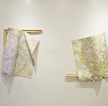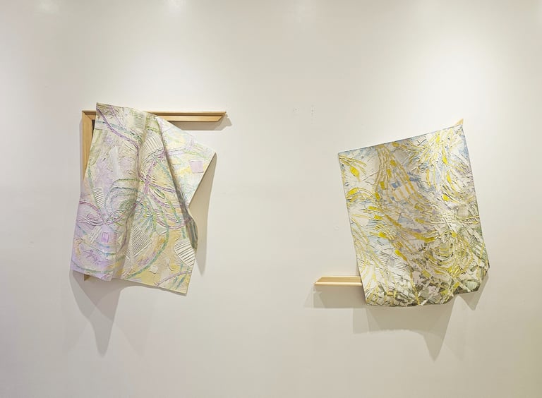 Her practice also reflects environmental responsibility. By recycling materials and minimizing waste, MaiYap acknowledges the tension between artistic creation and ecological impact, embodying a mindful approach that echoes her themes. Symbolic elements—such as wind-like patterns and gestural markings—further express the interconnectedness of human and natural systems. Together, these works encourage reflection on our shared responsibility for the environment.