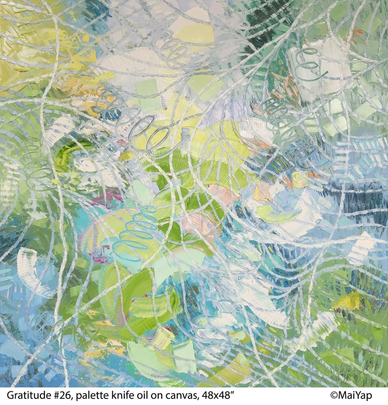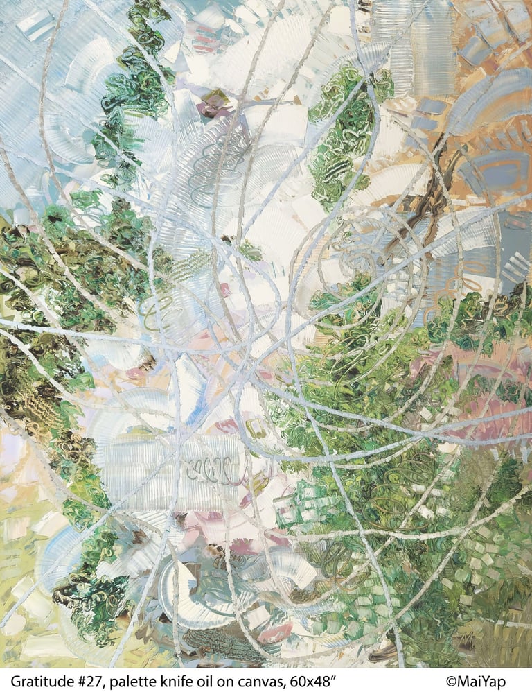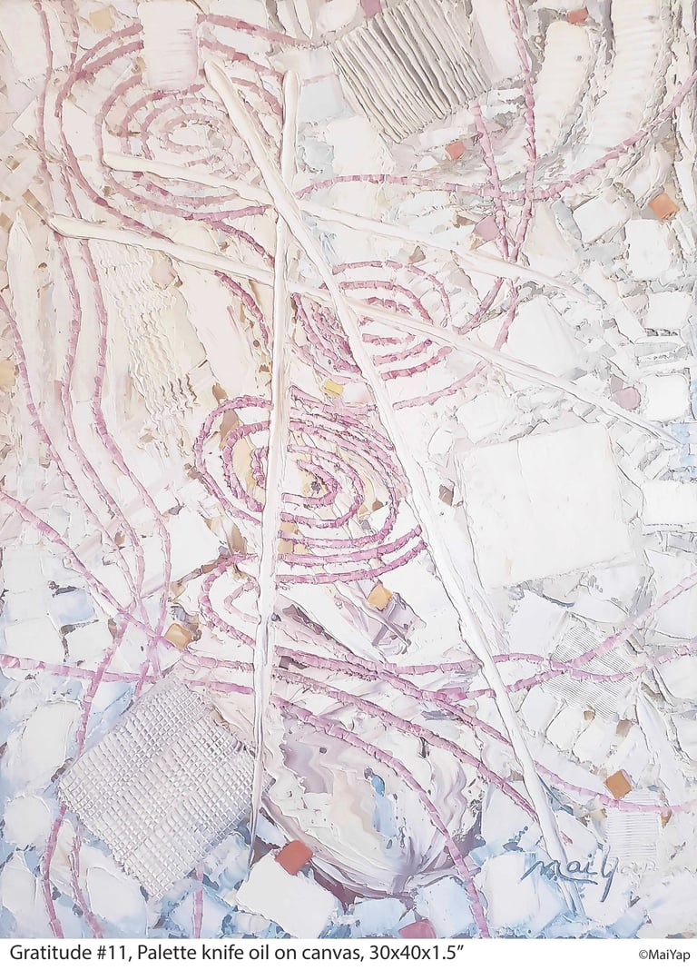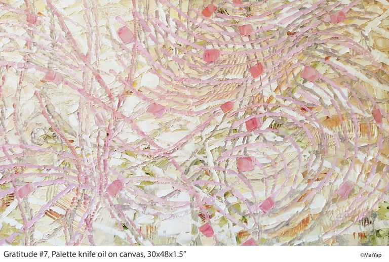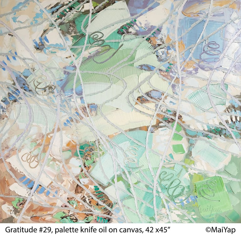 The 'Gratitude' series represents a significant milestone in MaiYap's artistic evolution. While she began moving away from realism as early as 2012, her journey into abstraction was characterized by a shift in her color palette—from vibrant, intense colors to muted, soft pastels. By adopting softer colors, MaiYap sought to convey a more subtle, yet profound message, suggesting that if people could see the beauty she captures, they might also listen more attentively to the planet's needs. Each piece, meticulously crafted with a palette knife, layers these gentle colors and textures to build tactile canvases that engage and demand contemplation. These textured strokes serve as metaphors for the intricate relationship between human activity and nature.
