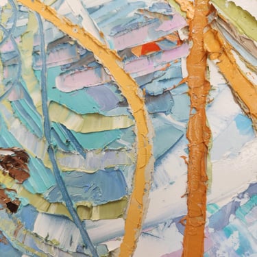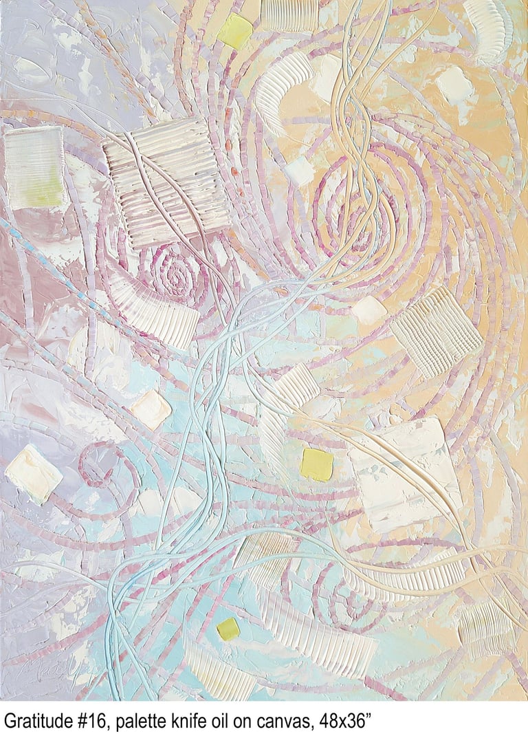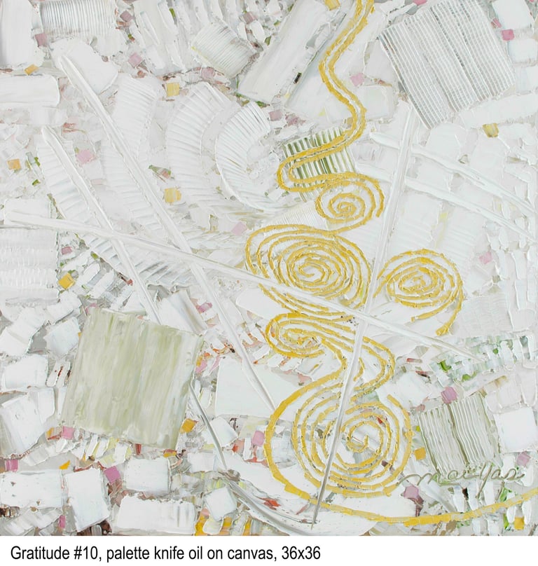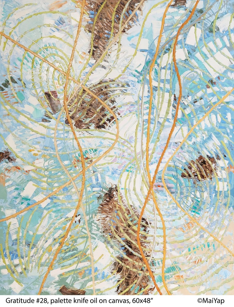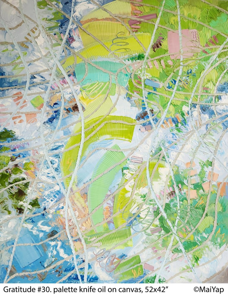 The 'Gratitude' series represents a significant milestone in MaiYap's artistic evolution. While she began moving away from realism as early as 2012, her journey into abstraction was characterized by a shift in her color palette—from vibrant, intense colors to muted, soft pastels. By adopting softer colors, MaiYap sought to convey a more subtle, yet profound message, suggesting that if people could see the beauty she captures, they might also listen more attentively to the planet's needs. Each piece, meticulously crafted with a palette knife, layers these gentle colors and textures to build tactile canvases that engage and demand contemplation. These textured strokes serve as metaphors for the intricate relationship between human activity and nature.
