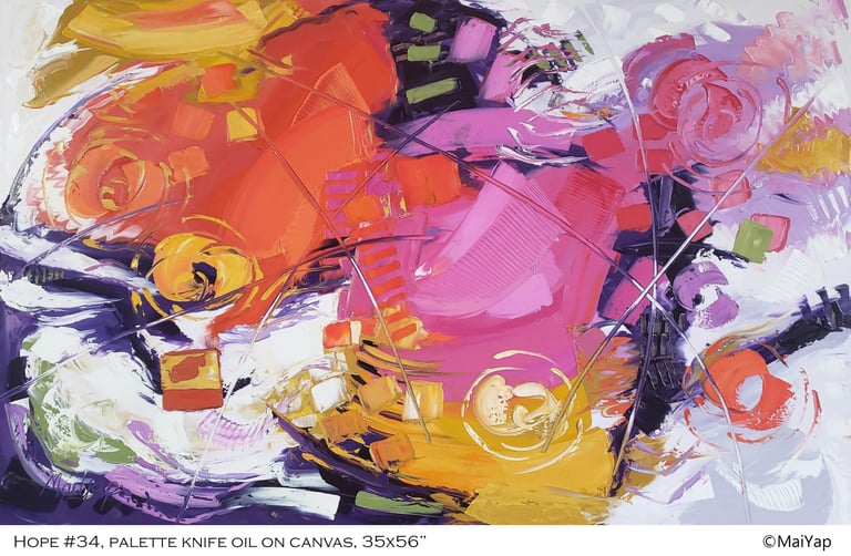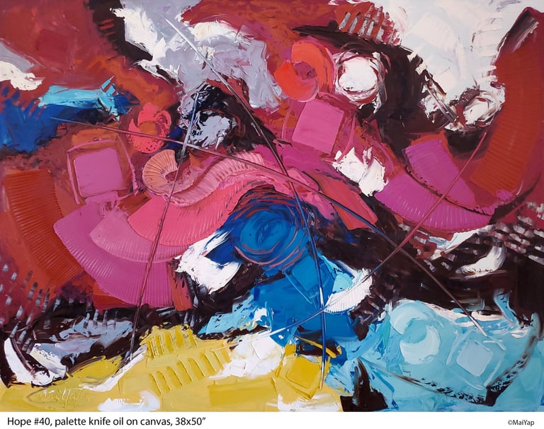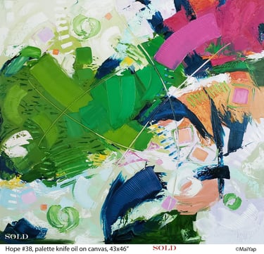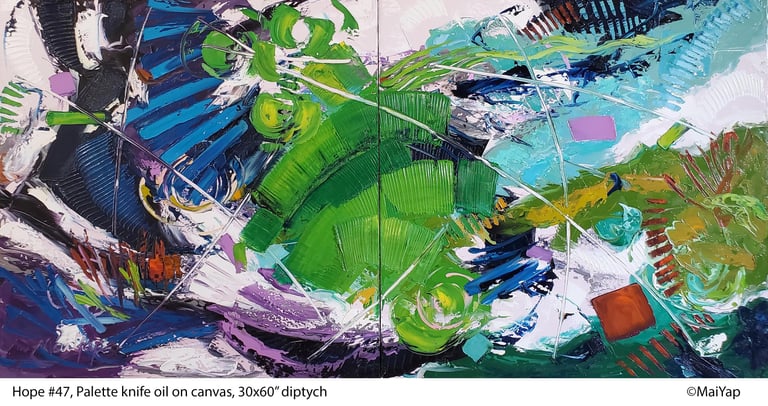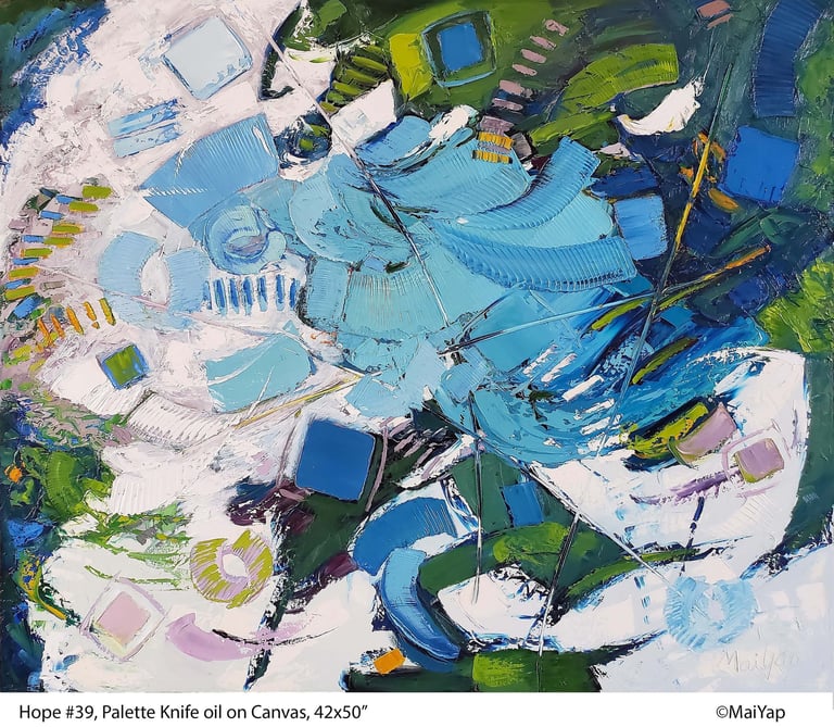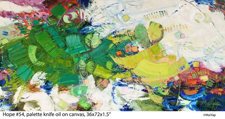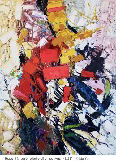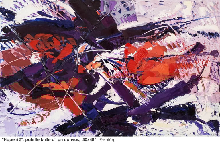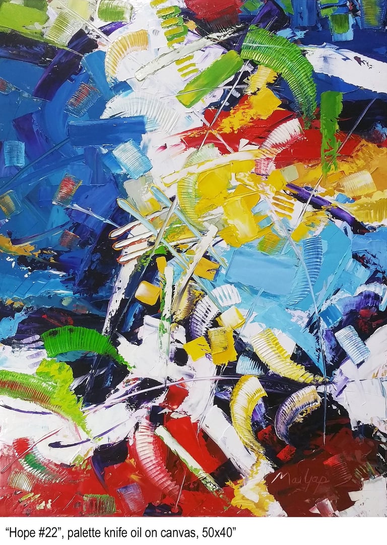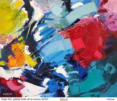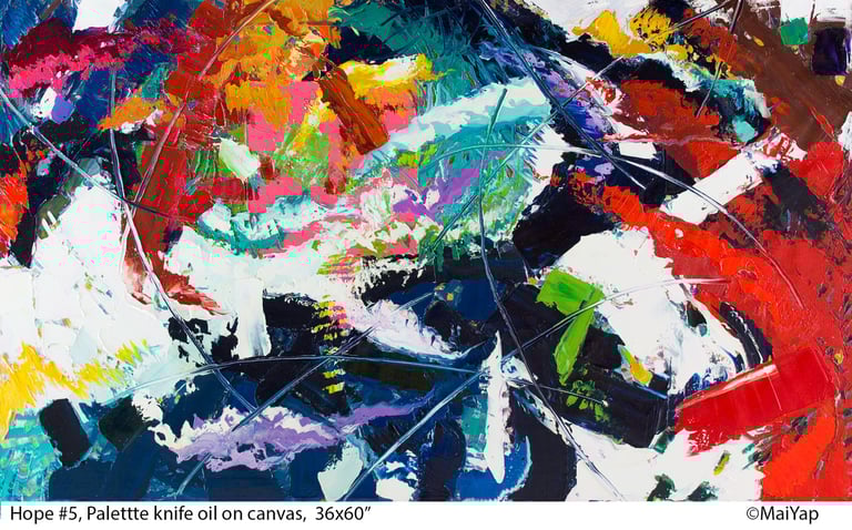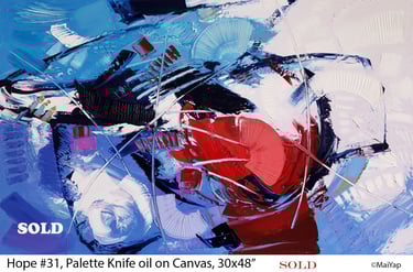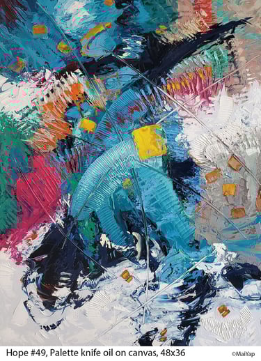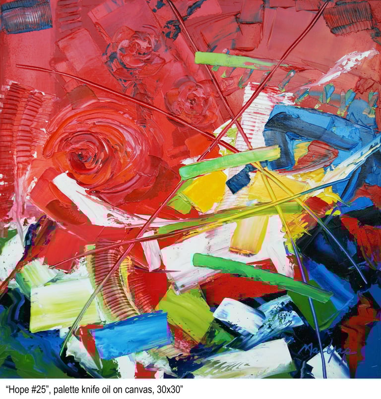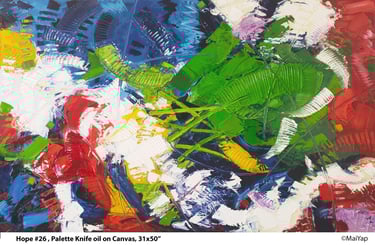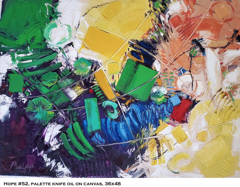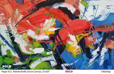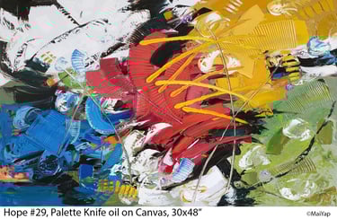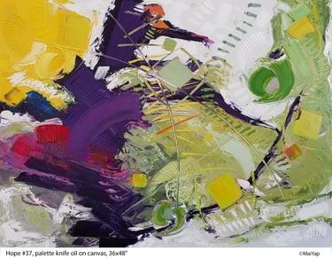 These series of paintings depict nature in motion. By means of abstractions, they try to explain and understand man’s disdain towards our environment. Color and movement mimic our planet’s cycles in all its glory. As if weaving a tapestry with paint, the images are built using a cornucopia of vibrant colors painstakingly applied, stroke-by-stroke, layer-by-layer. By manipulating pure oils using only palette knives, she is able to capture the essence of a butterfly dancing, the delicate feathers of a toucan or an insinuation of the brightest moon. When the work is finished, she “destroys” the image by making deep "cuts" to dramatize how our earth feels. The numerous layers of paint revealed solely through these cuts highlight the need to unravel the truth by digging deeper and taking action. Her paintings have been referred to as “sculptures in oil” because of their textures which can range from completely flat to several millimeters thick. The powerful, sometimes whimsical strokes are also tools to generate questions, which, in turn, help to disseminate her environmental message. She calls this series “HOPE”, in the hope that we can change and make a difference for the many generations to come.