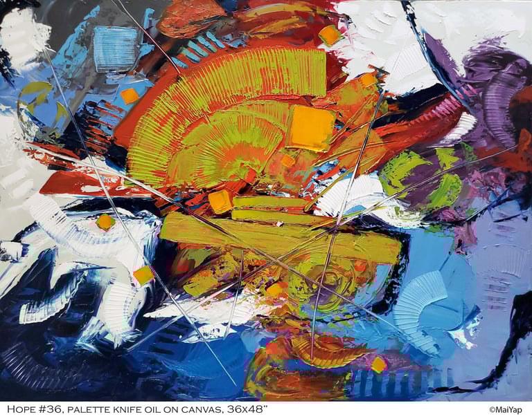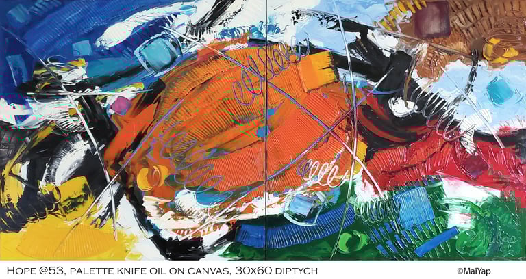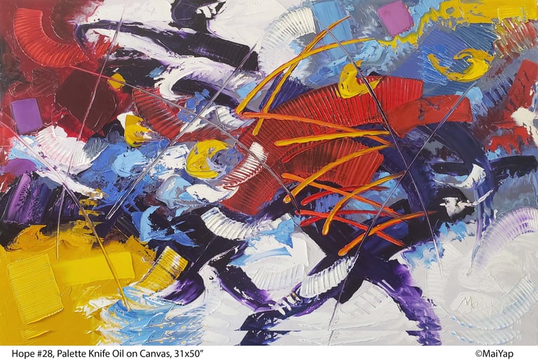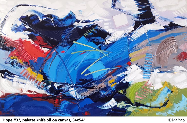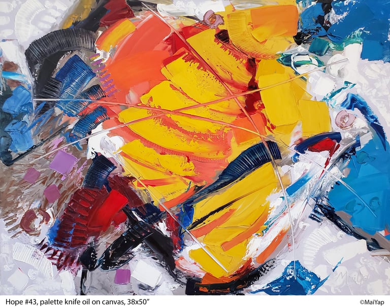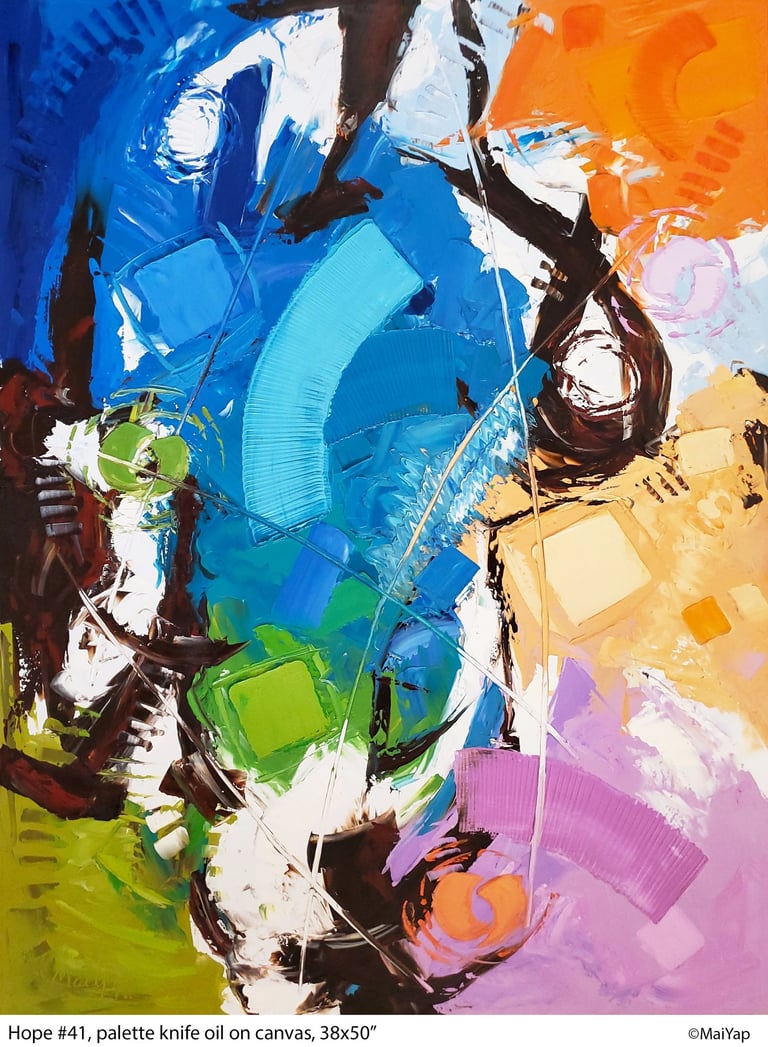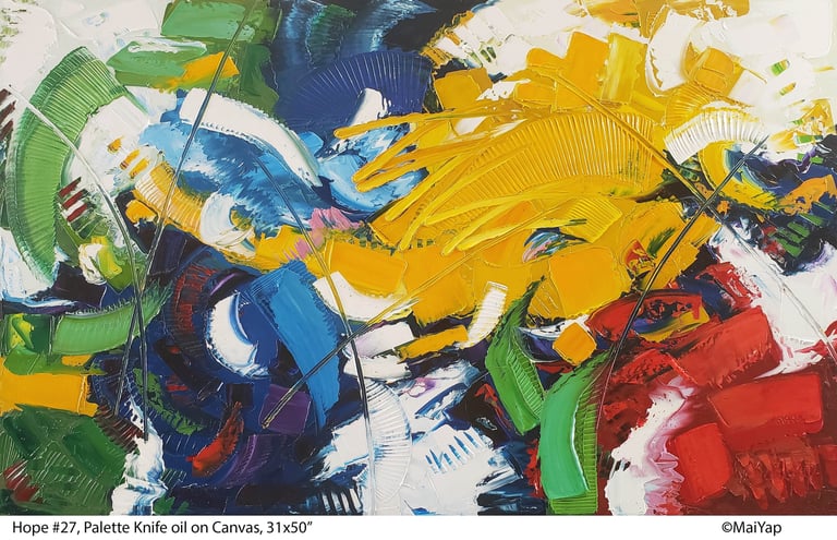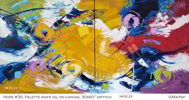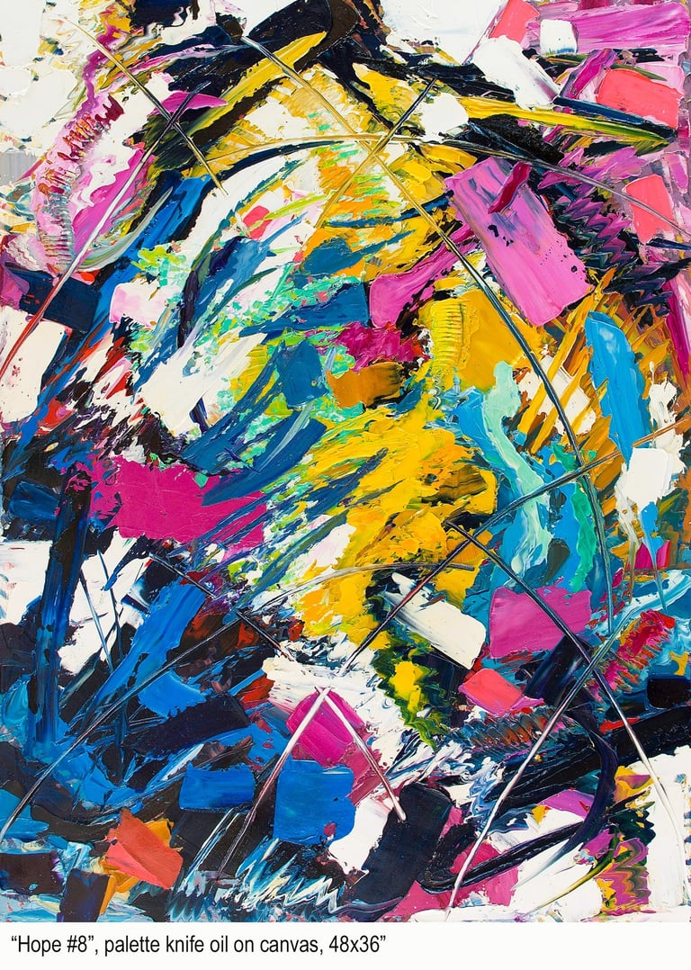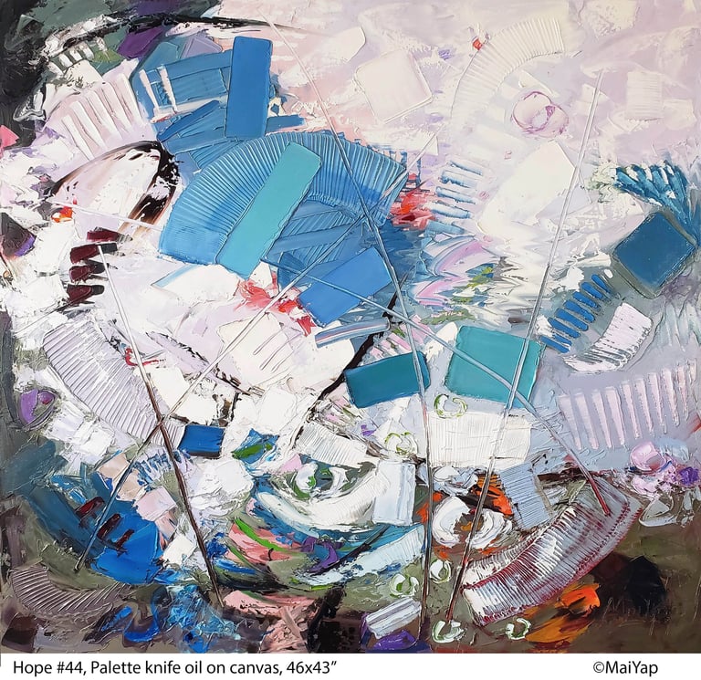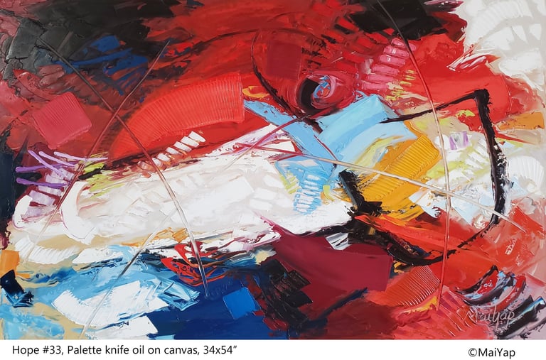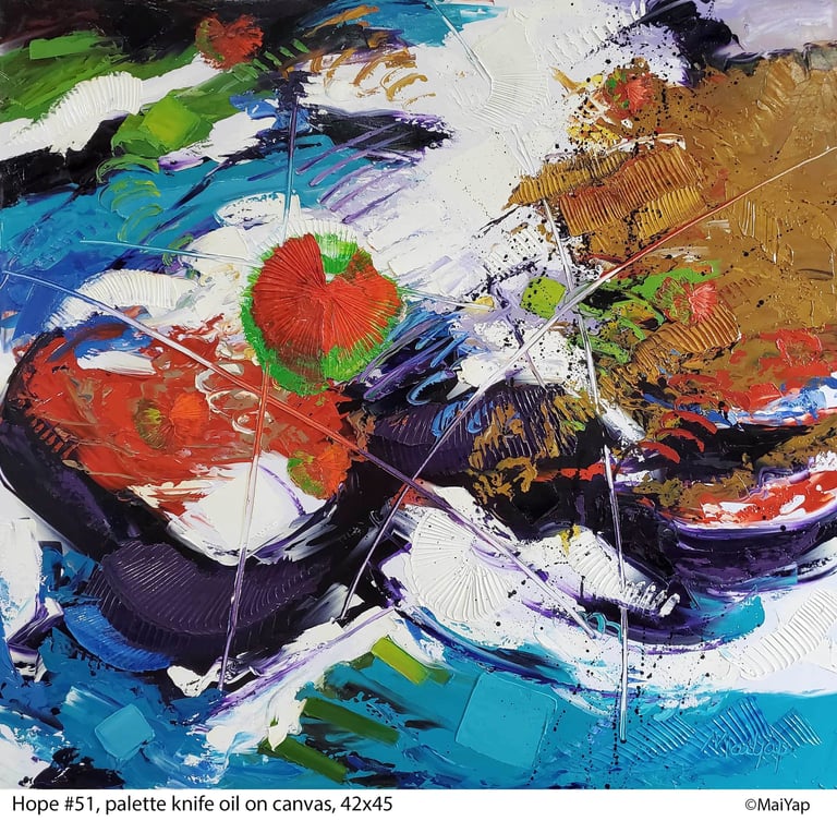 These series of paintings depict nature in motion. By means of abstractions, they try to explain and understand man’s disdain towards our environment. Color and movement mimic our planet’s cycles in all its glory. As if weaving a tapestry with paint, the images are built using a cornucopia of vibrant colors painstakingly applied, stroke-by-stroke, layer-by-layer. By manipulating pure oils using only palette knives, she is able to capture the essence of a butterfly dancing, the delicate feathers of a toucan or an insinuation of the brightest moon. When the work is finished, she “destroys” the image by making deep "cuts" to dramatize how our earth feels. The numerous layers of paint revealed solely through these cuts highlight the need to unravel the truth by digging deeper and taking action. Her paintings have been referred to as “sculptures in oil” because of their textures which can range from completely flat to several millimeters thick. The powerful, sometimes whimsical strokes are also tools to generate questions, which, in turn, help to disseminate her environmental message. She calls this series “HOPE”, in the hope that we can change and make a difference for the many generations to come.