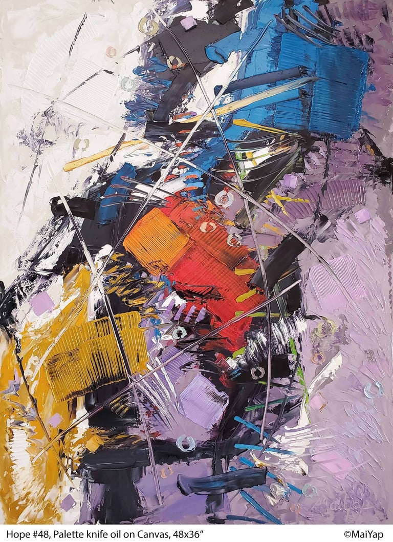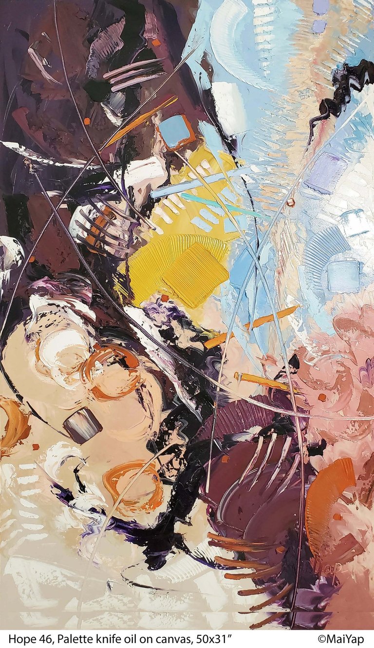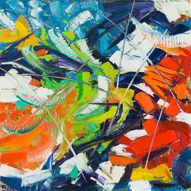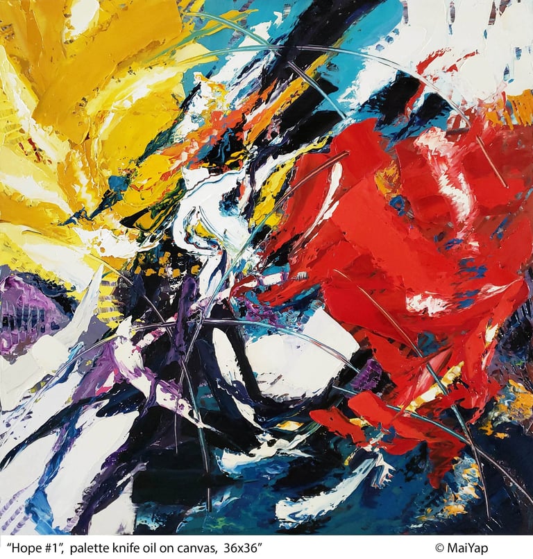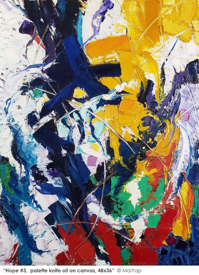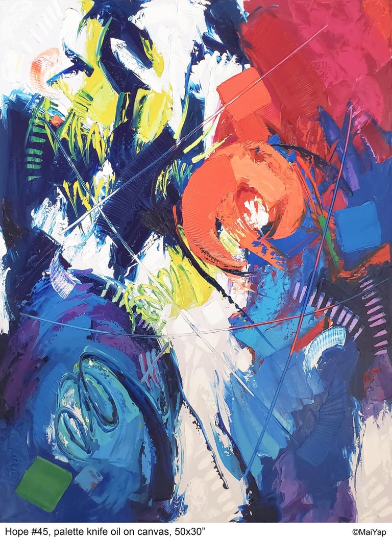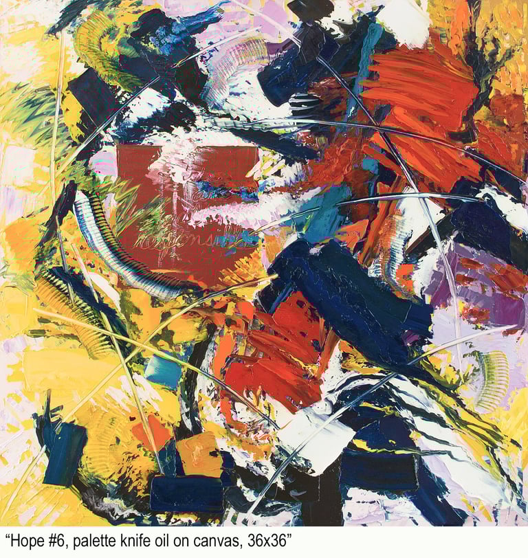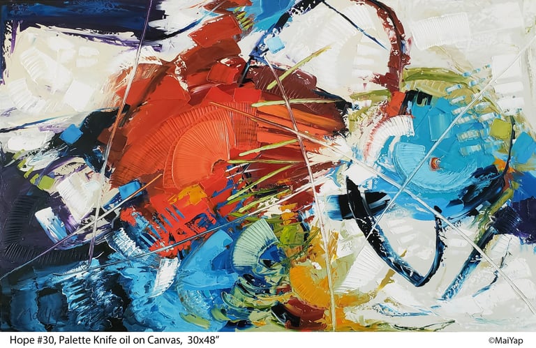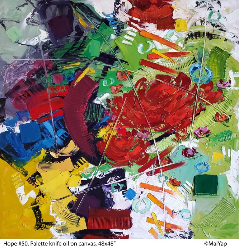 These series of paintings depict nature in motion. By means of abstractions, they try to explain and understand man’s disdain towards our environment. Color and movement mimic our planet’s cycles in all its glory. As if weaving a tapestry with paint, the images are built using a cornucopia of vibrant colors painstakingly applied, stroke-by-stroke, layer-by-layer. By manipulating pure oils using only palette knives, she is able to capture the essence of a butterfly dancing, the delicate feathers of a toucan or an insinuation of the brightest moon. When the work is finished, she “destroys” the image by making deep "cuts" to dramatize how our earth feels. The numerous layers of paint revealed solely through these cuts highlight the need to unravel the truth by digging deeper and taking action. Her paintings have been referred to as “sculptures in oil” because of their textures which can range from completely flat to several millimeters thick. The powerful, sometimes whimsical strokes are also tools to generate questions, which, in turn, help to disseminate her environmental message. She calls this series “HOPE”, in the hope that we can change and make a difference for the many generations to come.