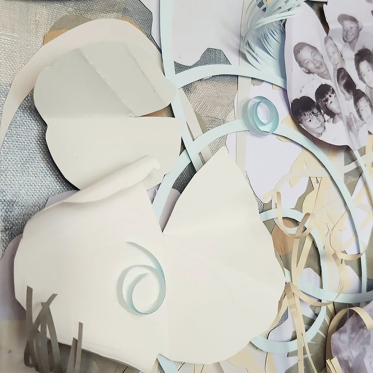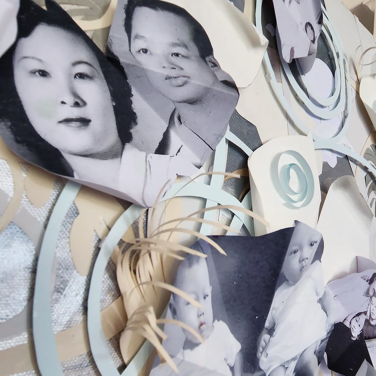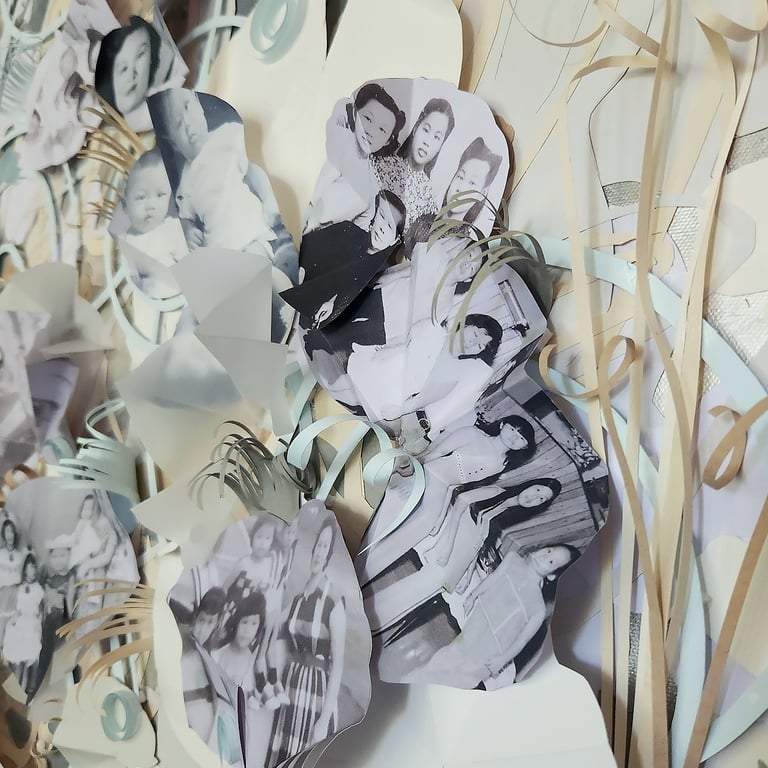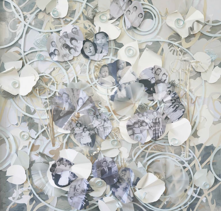 Following the Reflections on Awakening series, her practice shifted toward weaving the intimate threads of her own life and family history into the work. I Am the Pond employs a delicate paper collage technique inspired by traditional Chinese landscape painting, with water serving as both a symbol of life and the feminine principle (Yin). In this piece, archival family photographs take the shape of lily pads—forms that, like memory, rise from the depths, symbolizing birth, resilience, and the possibility of renewal.
