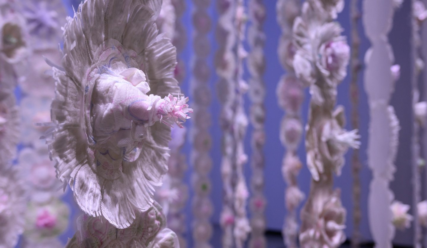 1,000 flowers made of sanitary napkins, cardboard, foam, glue and organza fabric.