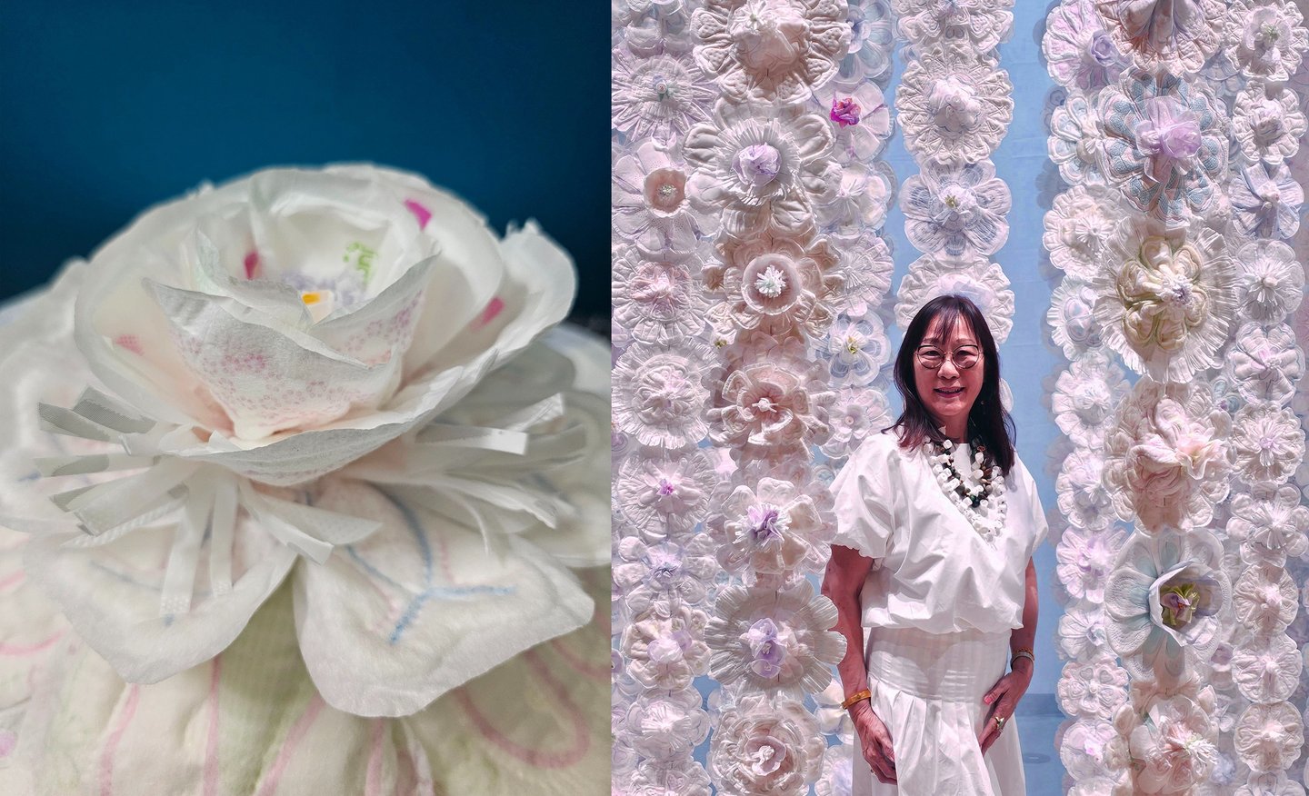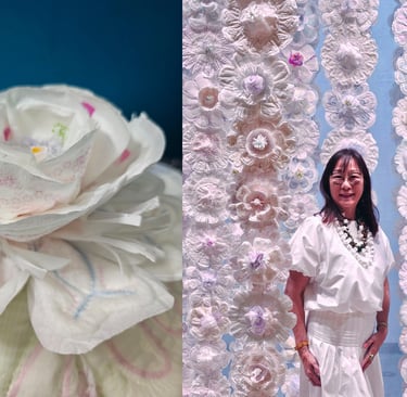MaiYap’s personal journey, which she openly shares, is woven into every layer of this work. As she navigated menopause’s physical and emotional toll, from hot flashes and brain fog to shifts in self-perception, she turned to art as a means of processing these experiences. Her research into menopause’s effects on memory, mood, and the body revealed a spectrum of silent struggles many women endure—isolated by societal discomfort, overlooked in the workplace, and unsupported by medical resources. Through her installation, she strives to bring these hidden realities into public view, using the visual impact of hundreds of sanitary pads transformed into flowers as a tribute to women’s resilience and adaptability.