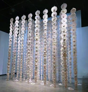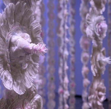 The towering scale of the installation reinforces the collective nature of this experience. Each flower is unique, yet together they form a unified field that speaks to the shared, often unspoken journey of countless women. The columns, like stalwart guardians of memory and experience, convey both the beauty and weight of this life phase. MaiYap draws on her heritage by incorporating elements of traditional Chinese values that honor familial legacy and feminine grace. Her reflections on her grandmothers, who embodied these qualities, serve as both a source of strength and a reminder of the continuity of womanhood—a lineage that endures and evolves through each generation.