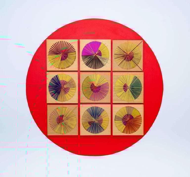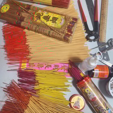 Total: Approximately 6,300 incense sticks, glue, 9 wood panels, red, black, and gold paint.